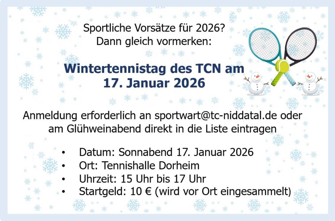 Eine Anmeldung ist nicht erforderlich. Wir freuen uns auf viele Teilnehmer! Bei Fragen bitte per E-Mail an vorstand@tc-niddatal.de wenden.